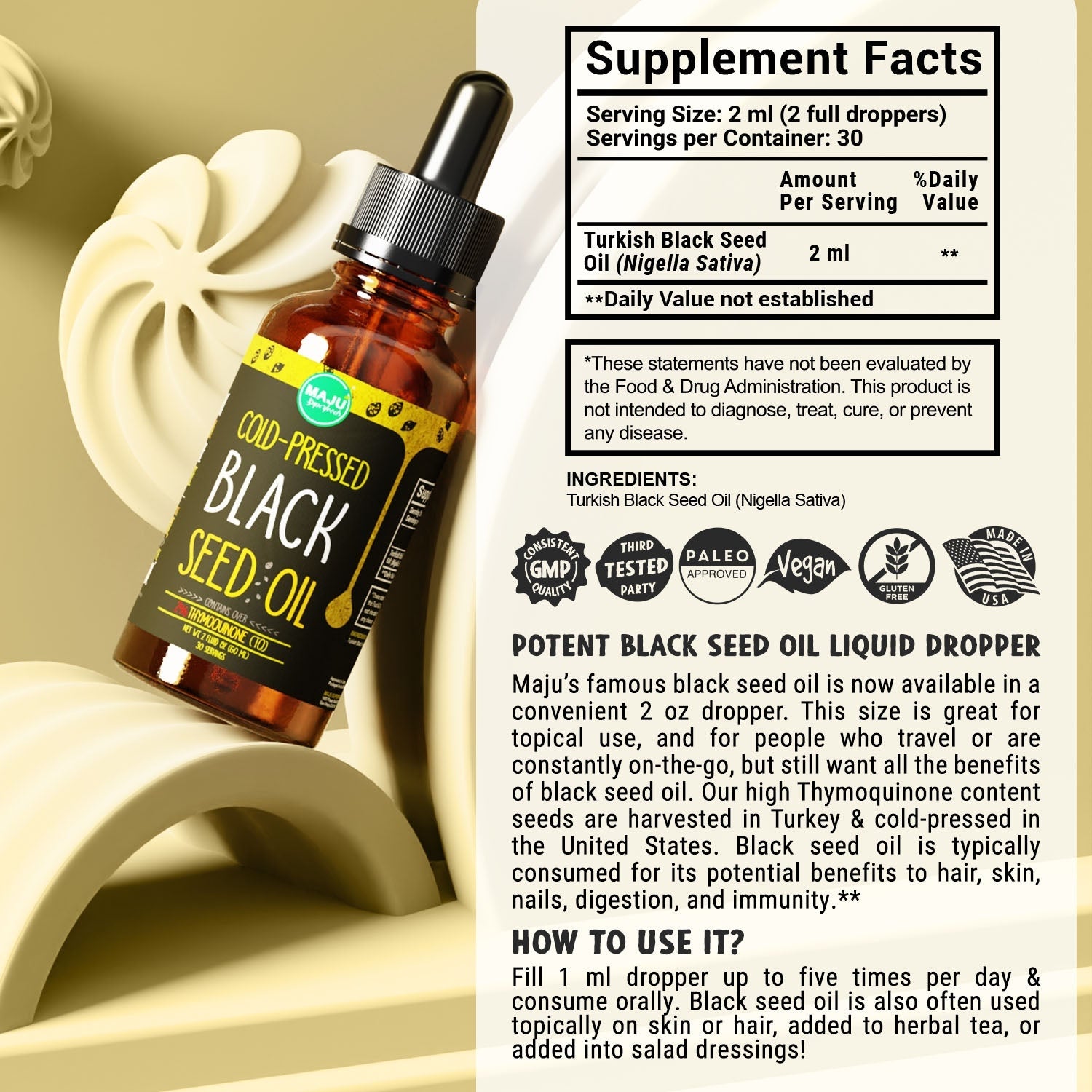 Maju’s Famous Black Seed Oil, now available in a convenient, on-the-go and TSA-approved dropper . Our black seed is grown and harvested from a reputable, family-owned farm in Turkey. This region is known for producing Black Seed Oil that is lighter in taste and color with an even higher concentration of the beneficial compounds such as healthy fats and Thymoquinone. The seeds are slowly cold-pressed, non-GMO, and are 100% pesticide or herbicide free. Stack Maju’s oil up against any USDA organic Black Seed Oil.