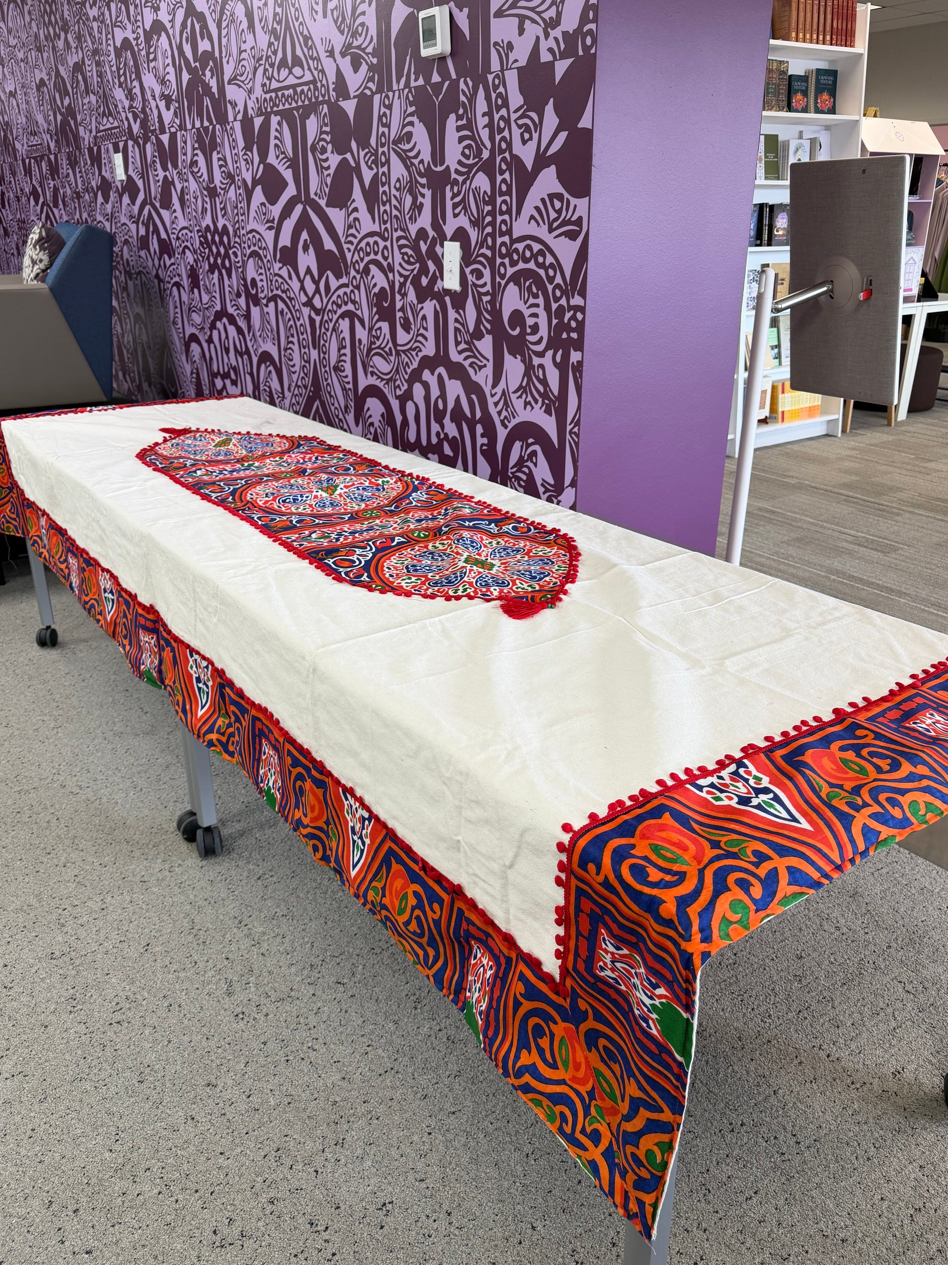 Elevate your home décor with this elegant decorative table cloth, featuring a soft neutral base, vibrant red, orange, blue pattern, and charming print. Its timeless design makes it perfect for Ramadan decorations, adding a warm and festive touch to iftar tables and coffee tables.