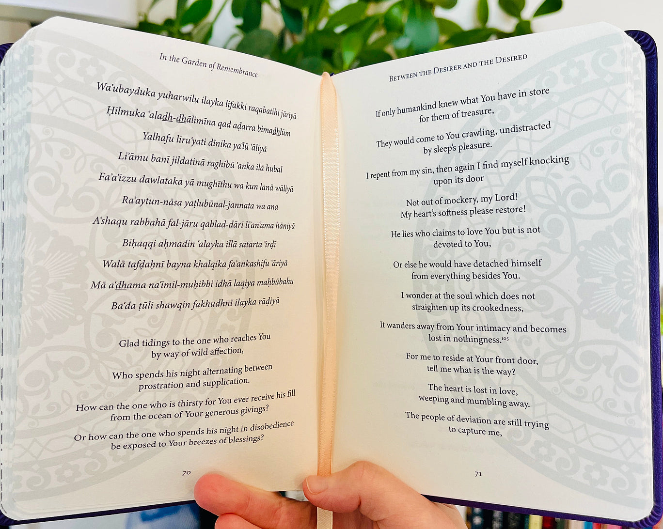"The quality of this book is amazing, from the soft, flexible cover with its beautifully embossed design, to the built-in ribbon bookmark and thick, creamy paper. The English is clear, natural, and poetic, and the transliteration of the Arabic is so useful for those who can't read Arabic text."