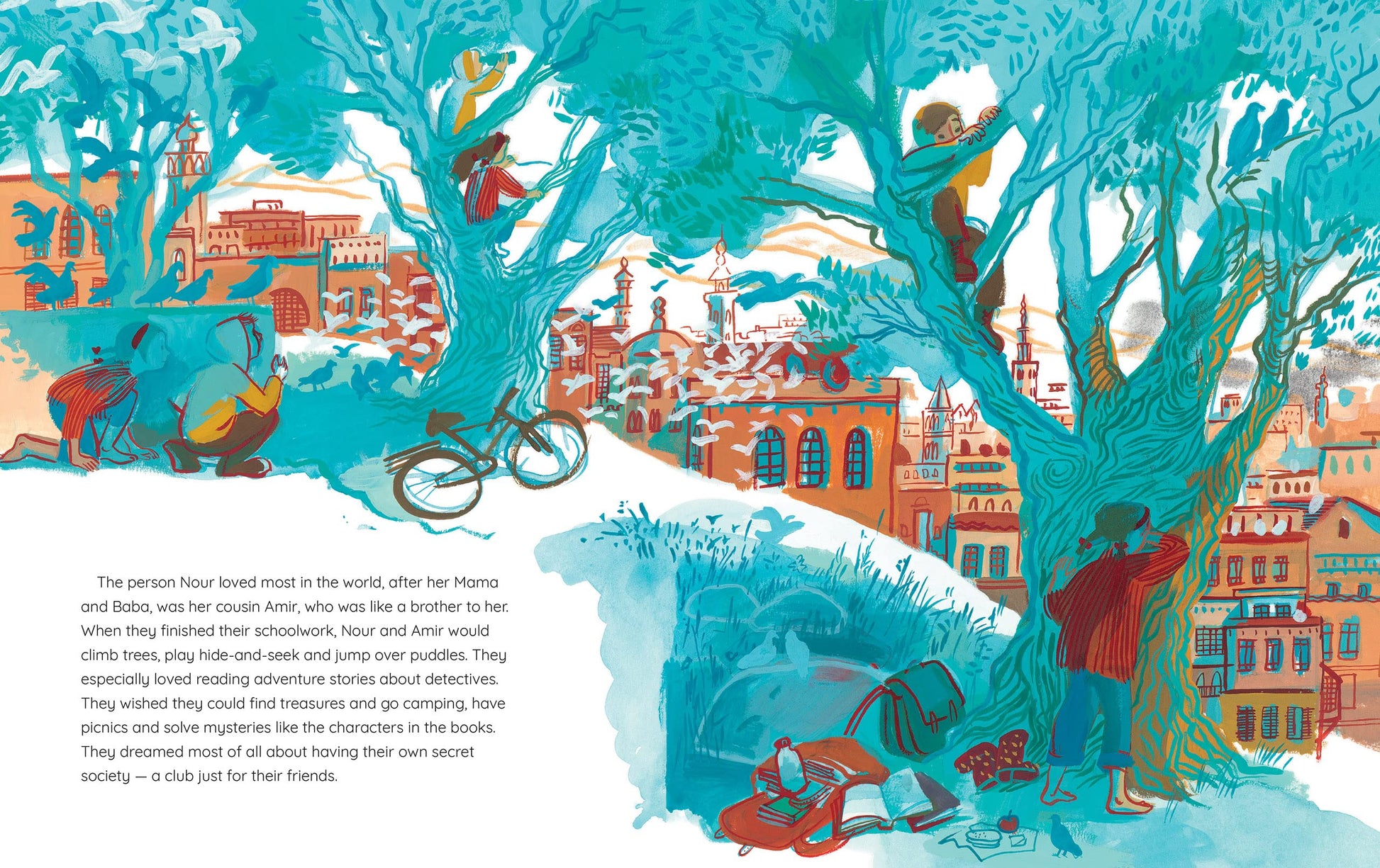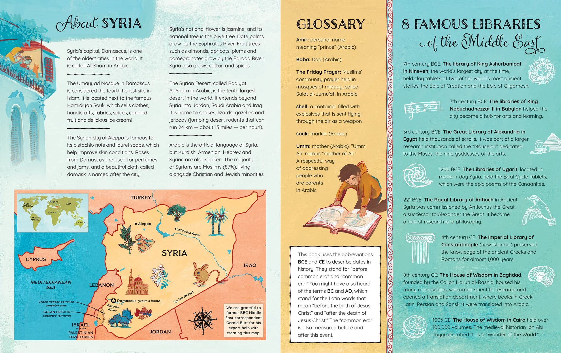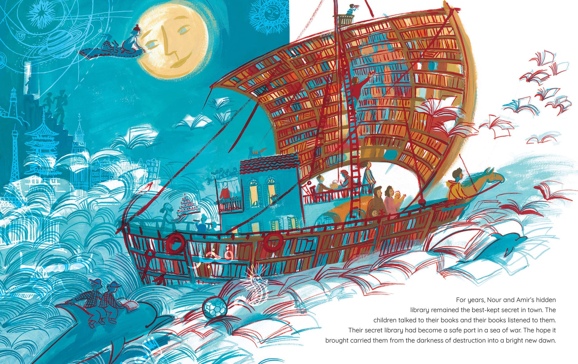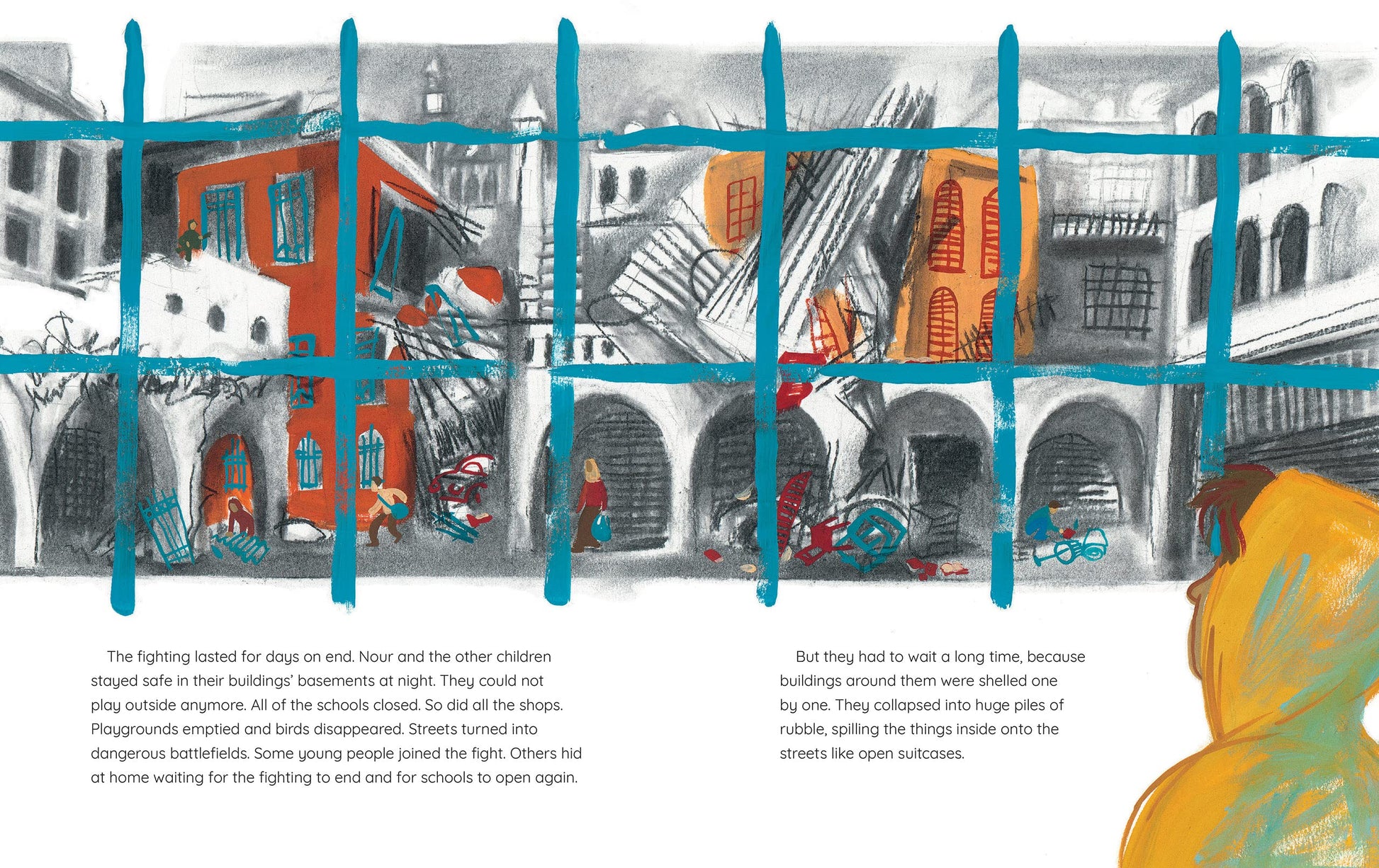 Forced to take shelter when their Syrian city is plagued with bombings, young Nour and her cousin begin to bravely build a secret underground library. Based on the author’s own life experience and inspired by a true story, Nour’s Secret Library is about the power of books to heal, transport and create safe spaces during difficult times. Illustrations by Romanian artist Vali Mintzi superimpose the colorful world the children construct over black-and-white charcoal depictions of the battered city.