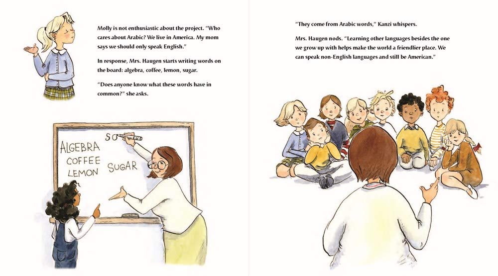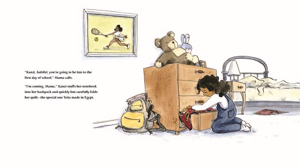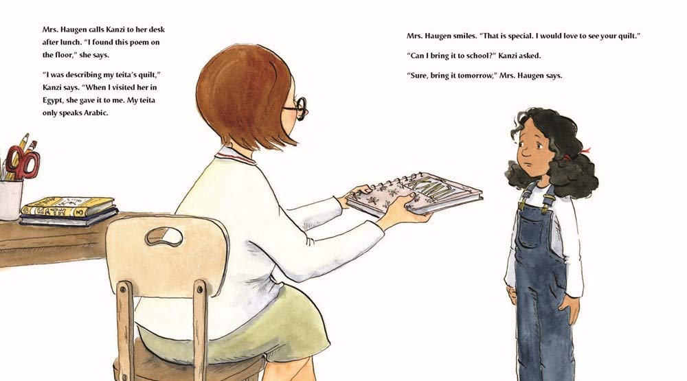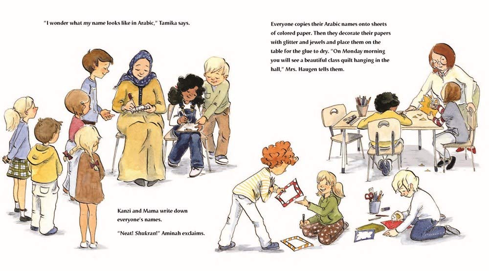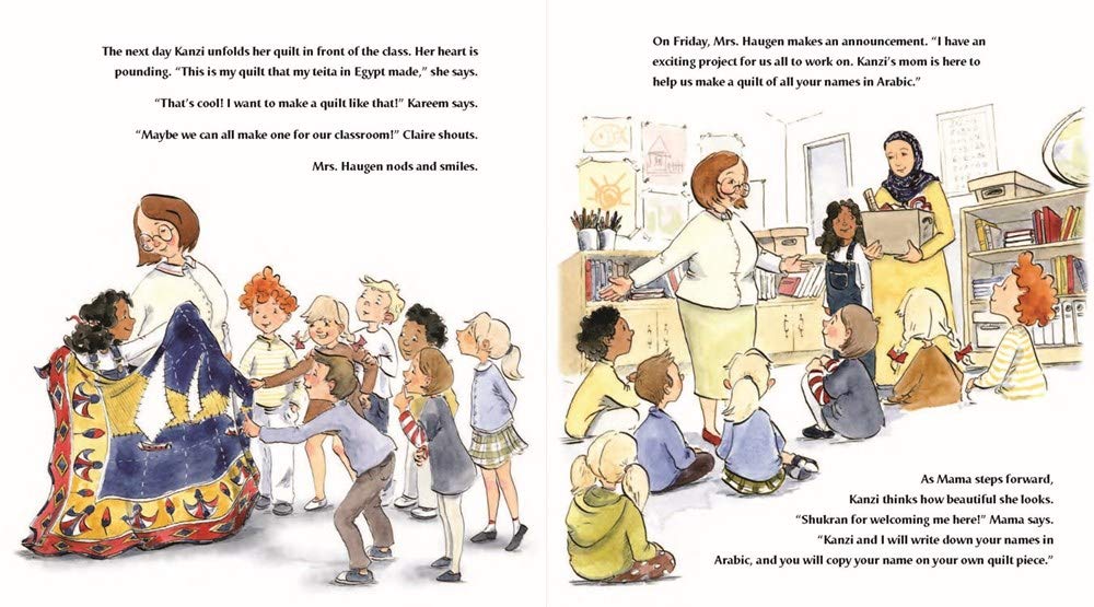 That night, Kanzi wraps herself in the beautiful Arabic quilt her teita (grandma) in Cairo gave her and writes a poem in Arabic about the quilt. Next day her teacher sees the poem and gets the entire class excited about creating a "quilt" (a paper collage) of student names in Arabic. In the end, Kanzi's most treasured reminder of her old home provides a pathway for acceptance in her new one.