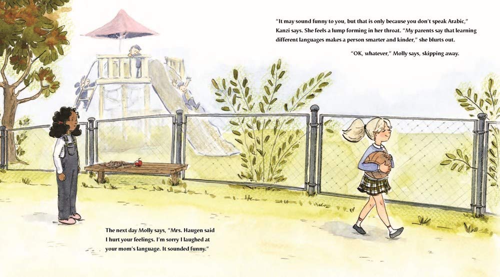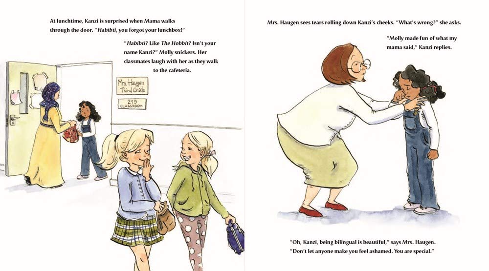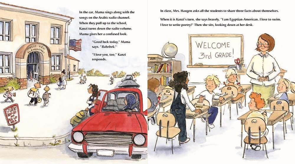 Kanzi's family has moved from Egypt to America, and on her first day in a new school, what she wants more than anything is to fit in. Maybe that's why she forgets to take the kofta sandwich her mother has made for her lunch, but that backfires when Mama shows up at school with the sandwich. Mama wears a hijab and calls her daughter Habibti (dear one). When she leaves, the teasing starts.